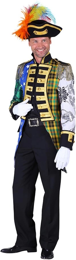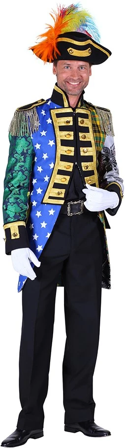 Details: de jas is afgewerkt met goudkleurig band. Op de schouders zitten zwarte epauletten met goudkleurige franjes, de epauletten zitten vast met een knoop.