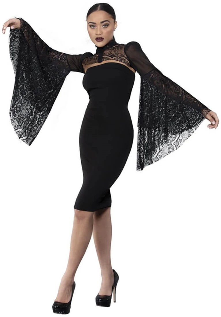 Details: kanten ontwerp met hoge hals en uitlopende mouwen
