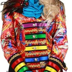Detail: zwarte epauletten met gouden franjes, satijn lint op de mouw in de kleuren rood, geel en groen. Satijn lint aan de voorzijde in de kleuren paars, groen, geel, blauw en rood