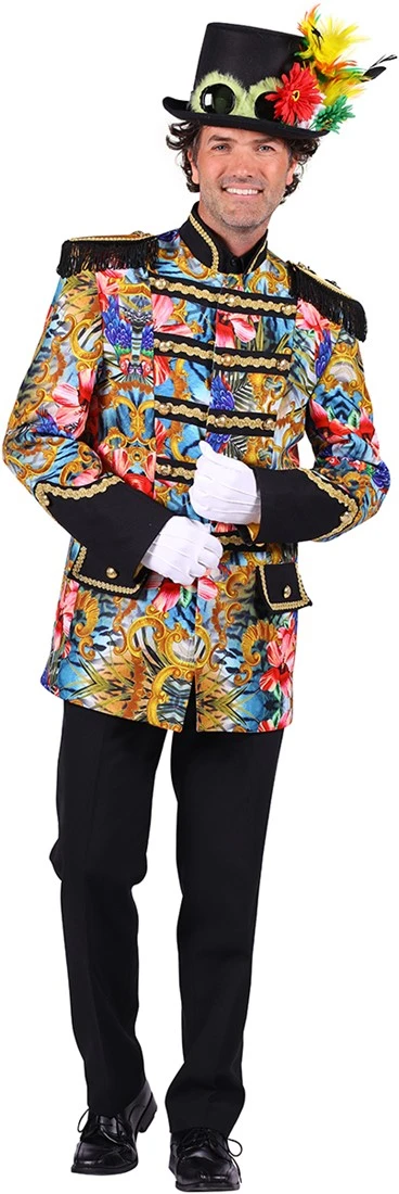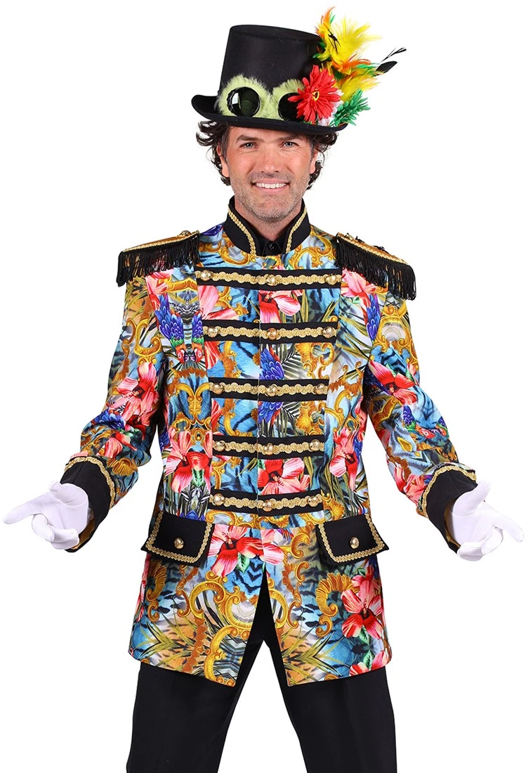 Een gave carnavalsjas voor heren, met prachtige gouden details! Deze vrolijke herenjas heeft een multi gekleurde print van onder andere bloemen en pappegaaien.