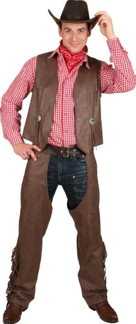 Mooi Cowboy kostuum lederlook bruin voor heren. Het kostuum bestaat uit een vest en de chaps.