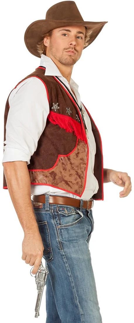 Details: een bruine waslederen look met rode randen en rafels en versierd met zilverkleurige (plastic) sterren