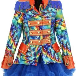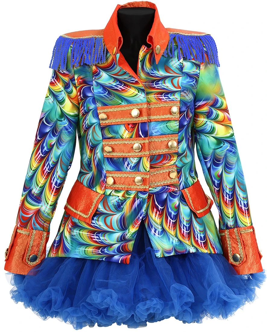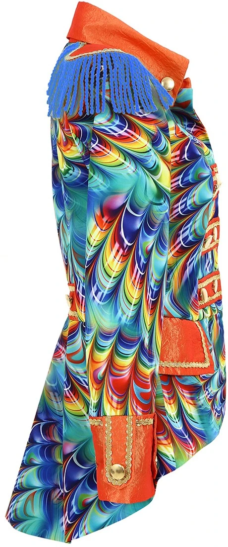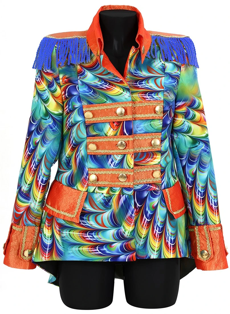 Details: oranje metallic stroken voorzien van gouden details en goudkleurige knopen. Ook de uiteinde van de mouwen en de kraag is oranje metallic met gouden details en goudkleurige knopen.