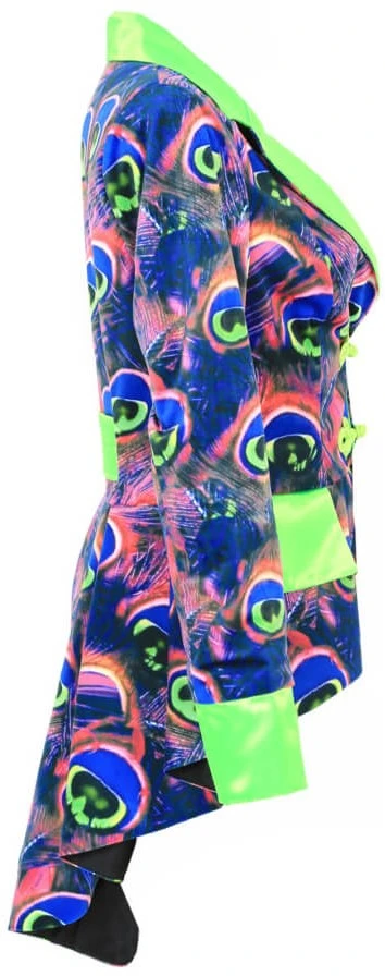 Details: de voorkant van de jas is kort wat langer door loopt naar achteren. De kraag, mouwen en zakken zijn in een effen neon kleur