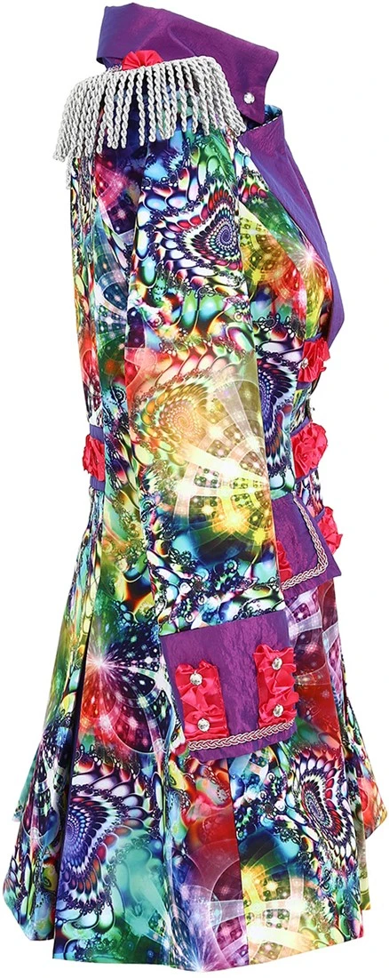 Epauletten: deze zijn er niet van af te nemen. Ze zijn paars met pinkkleurige details en hebben zilverkleurige franjes.