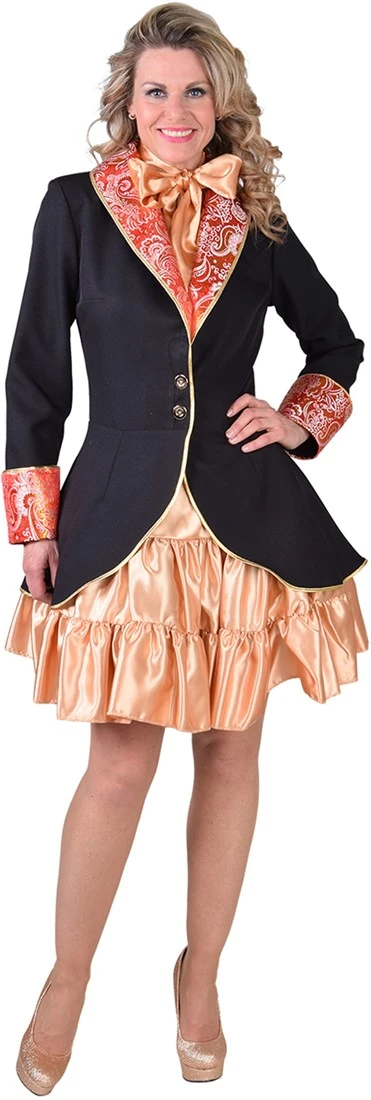 Details: de kraag en de manchetten hebben een brocante stof en de jas is afgezet met een goud band