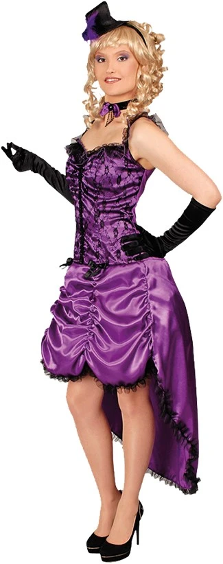 Een mooie paarse jurk met zwarte kanten details en strikjes. De jurk is goed te gebruiken bij een saloon thema, maar net zo goed voor Halloween met de juiste accessoires (apart verkrijgbaar).