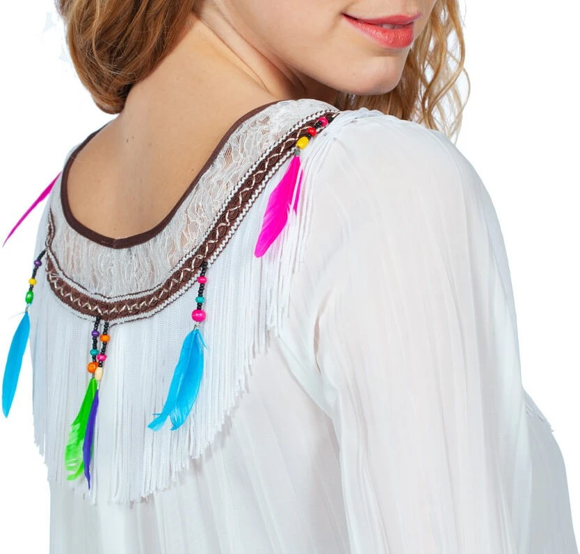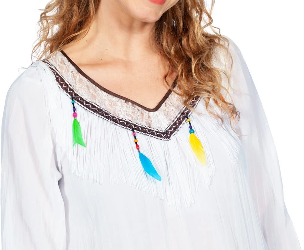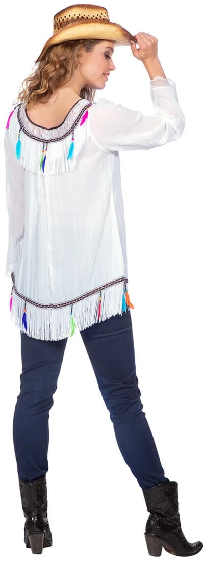 - Deze zomerse blouse heeft mooie franjes en een veertjes band met Ibiza kralen.