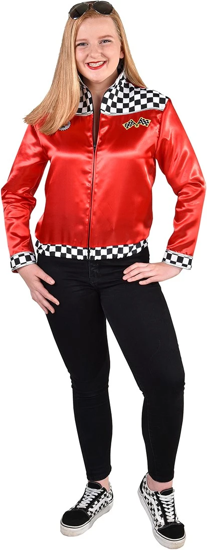 Details: glimmende rode stof met op de kraag, mouwen en onderkant een blokjes motief. Op de borst 2 finish vlaggen en een embleem met de nr 1 racing