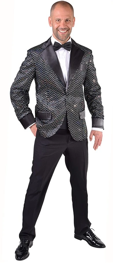 Mooi heren colbert met een zwarte kleur. Zwarte satijnen kraag en bewerkt met pailletten. Geschikt voor uw disco party, gegarandeerd succes. Gemaakt van 100% polyester.