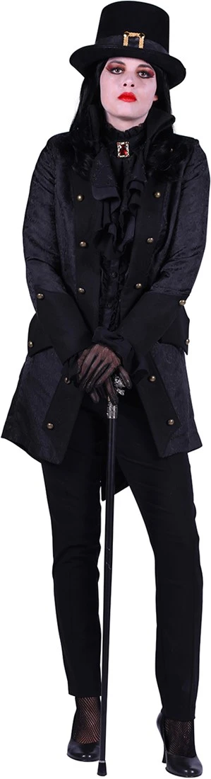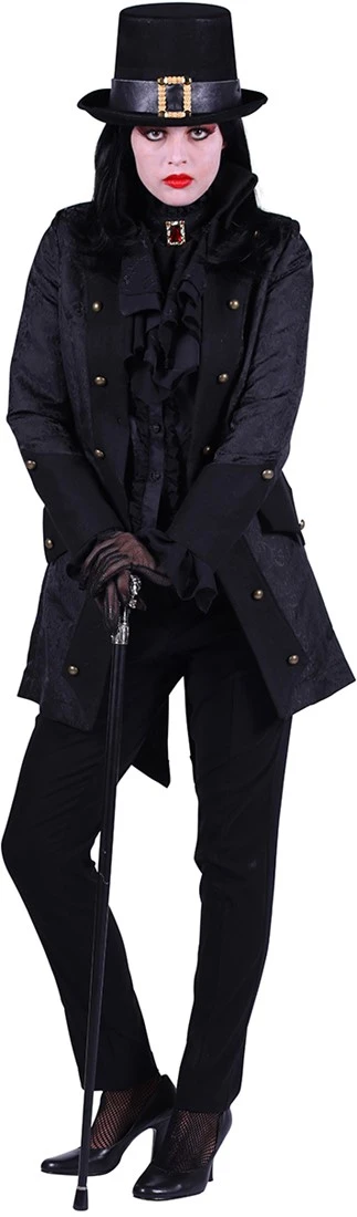 Deze donkere damesjas is goed te combineren met allerlei Halloween kostuums, maar toch echt het beste voor een dracula/vampier kostuum.