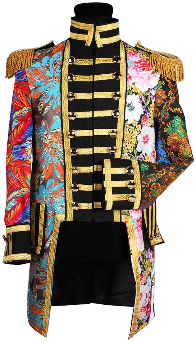 Details: voorop de jas zitten 18 knopen die terug komen op de mouwen, opstaande kraag en epauletten op de schouders