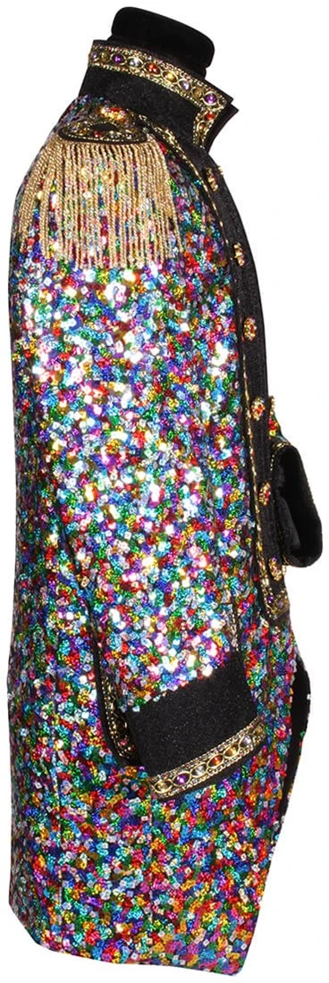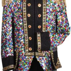 Details: allemaal gekleurde pailletten en de hals, borst, polsen en epauletten zijn versierd met multi gekleurd band.