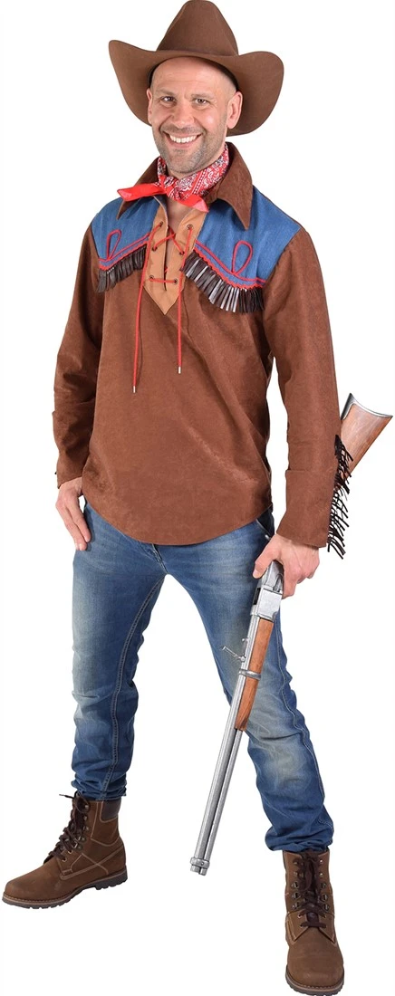 Details: op de schouders zitten jeans vlakken en de boord is van nep leer. Bij de borst en mouwen zitten franjes
