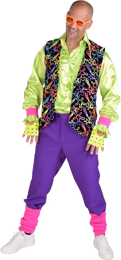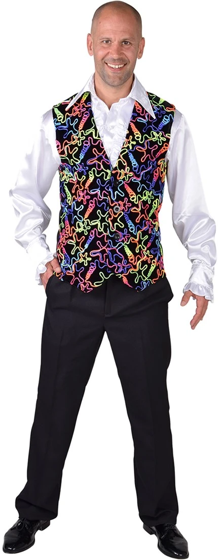 Met dit gilet multi neon strings val jij wel echt op op het disco feestje! Het heeft vrolijke kleuren en sterren in vloeiende lijnen als patroon!