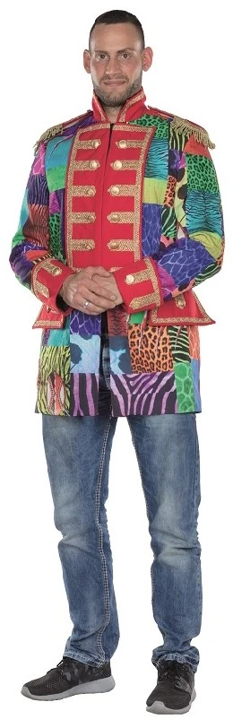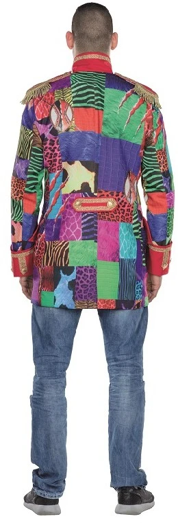 Deze jas met verschillende dierenvacht patronen in vrolijke kleuren en de rode met gouden details, zorgt ervoor dat jij wel op valt tussen de feestvierders!