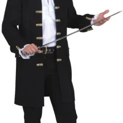 Een stoere zwarte piratenjas voor heren. De jas is egaal zwart en heeft een luxe afwerking. Overal op de zwarte jas zitten brons/goudkleurige details zoals (plastic) knopen met opdruk en gouden bandjes. De jas heeft mooie manchetten met dezelfde oudgouden details. De “steekzakken” zijn decoratief. Deze jas is gemaakt van 100% polyester.