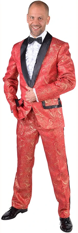 Een rood gevoerd herenkostuum met een gouden brokaat patroon. De colbert heeft semi-glanszwarte revers en details bij de (nep-)zakken. Het maatpak wordt geleverd inclusief de colbert en de broek. Bijpassende accessoires of overhemden zijn apart verkrijgbaar. Gemaakt van 95% polyester/brokaat en 5% metallic gouden stof.