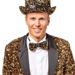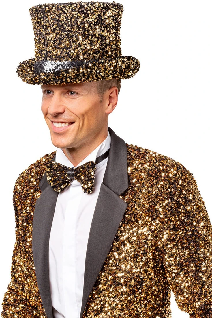 Details: de gehele hoed is bedekt met gouden pailletten met een band zwarte pailletten