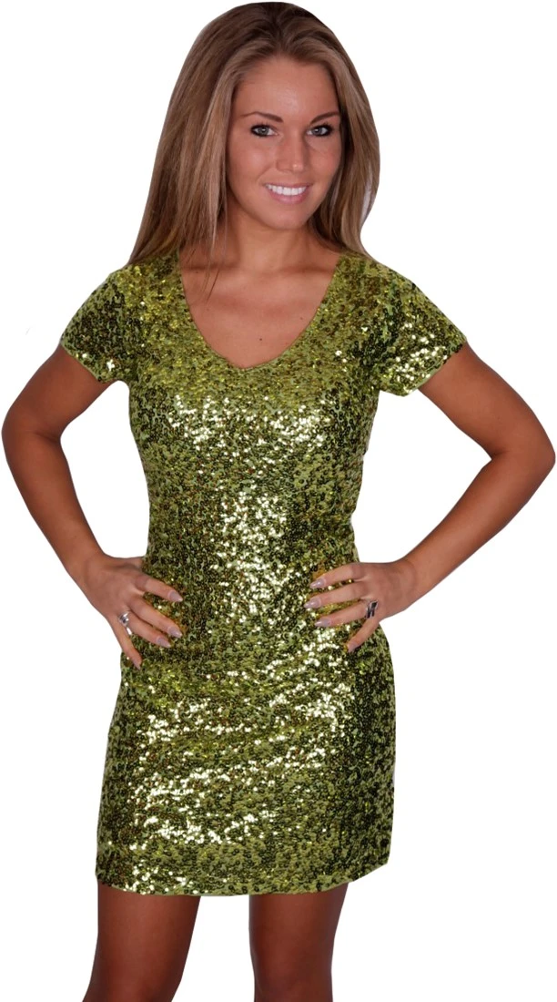 Een prachtig pailletten jurkje in de kleur lime groen, erg leuk voor bijvoorbeeld een glitter en glamourfeest. Het jurkje is versierd met allemaal lime groene pailletten en is ongeveer 85cm lang.