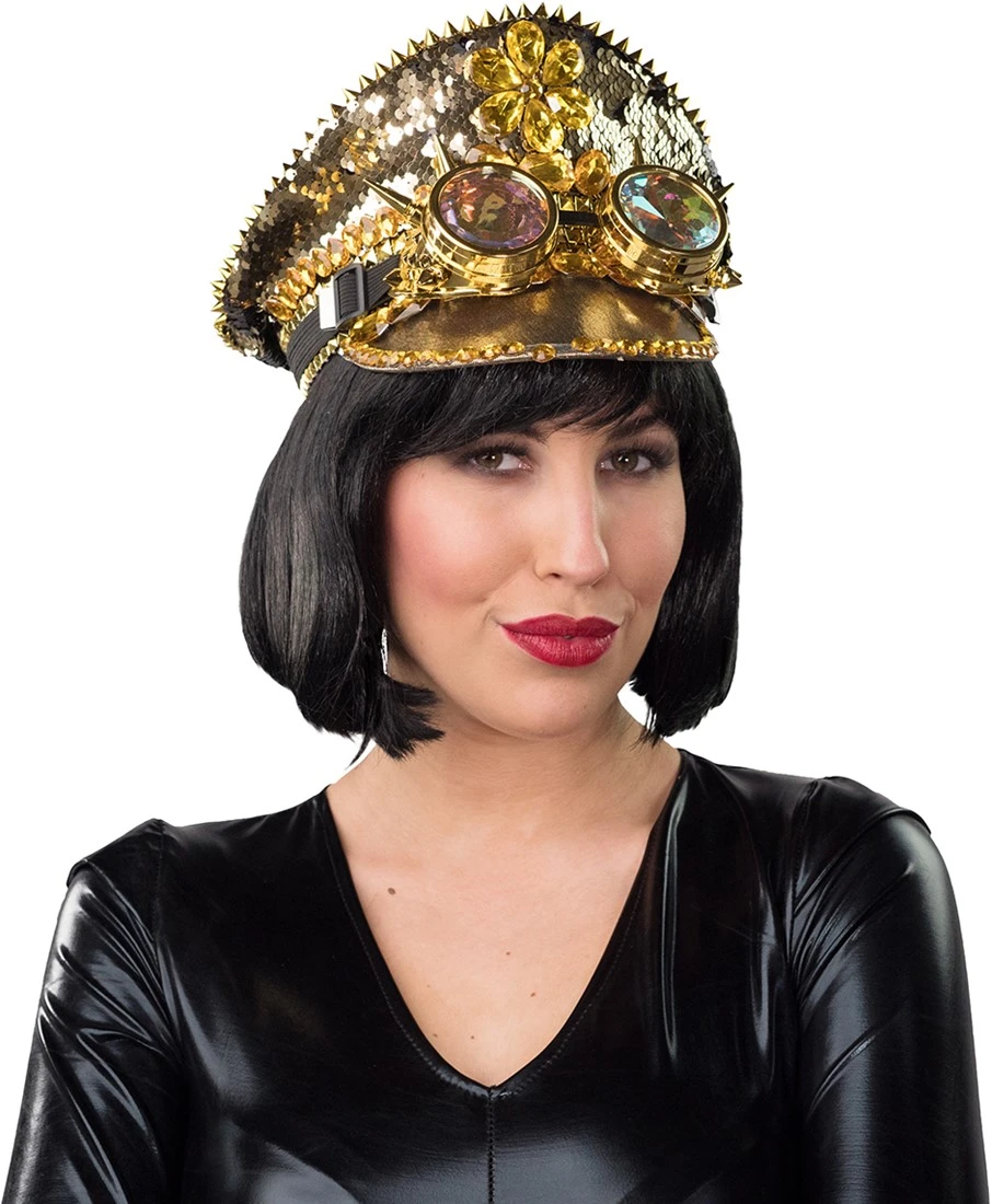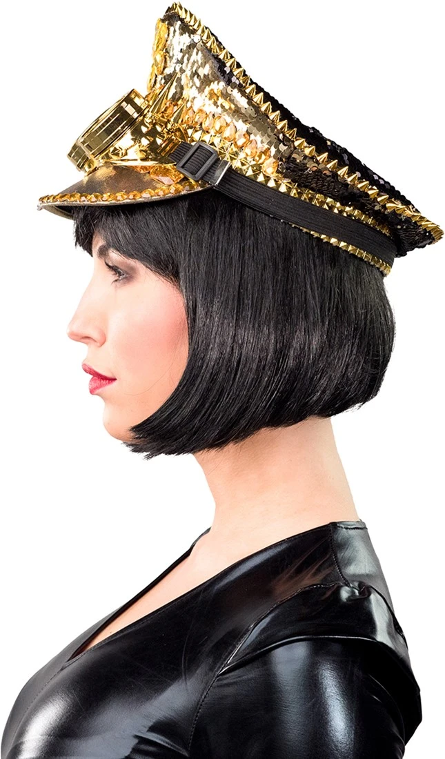 Details: grote oranje stenen aan de voorzijde van de pet, langs de bovenste rand van de pet zitten gouden studs