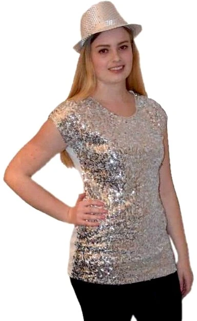 Een leuk shirt met pailletten om te dragen met bijvoorbeeld een glitter en glamour feestje! Het zilveren shirt heeft aan de voorkant zilveren pailletten zitten en is aan de achterkant effen wit. Dit Shirt Plussize Pailletten Zilver is gemaakt van 100% polyester.