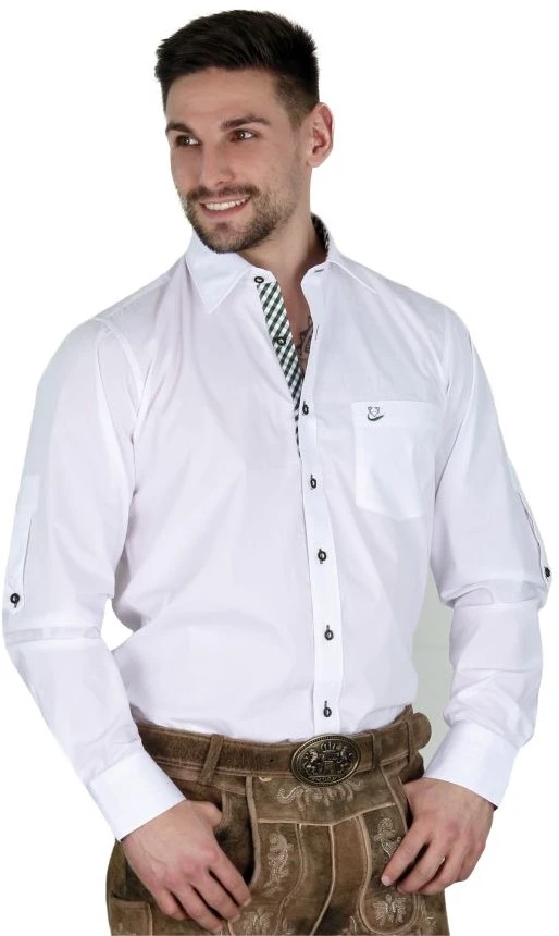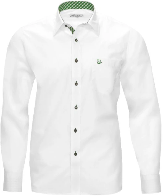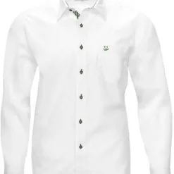 Een mooie witte trachten overhemd met groene details in de nek en bij de mouwen. Dit overhemd heeft een borstzakje aan de linkerkant.
