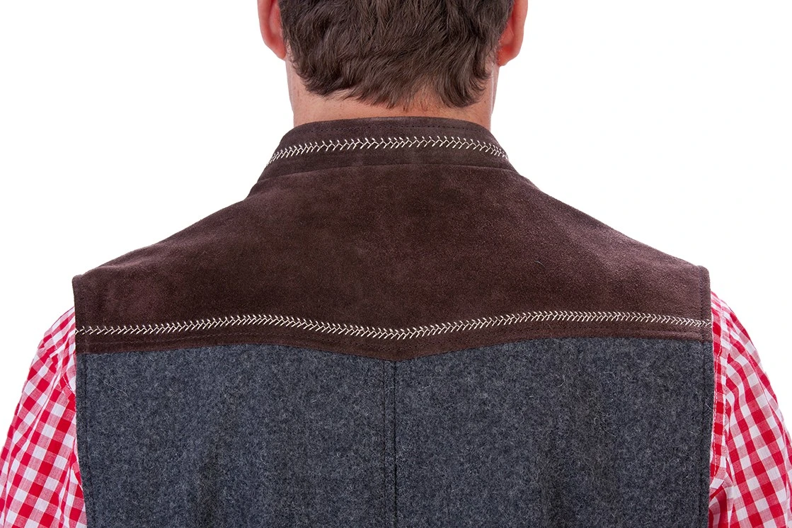Een prachtig trachtenvest van wol met aan de boverkant een leren stuk voor een authentiek resultaat. Met aan de voorkant knopen van hirschhorn materiaal.Perfect voor een oktoberfest.