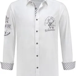 Een prachtig en elegant trachtenhemd voor heren in het wit, met mooie lichtgrijze borduursels en andere details. Perfect voor iedere Oktoberfest baas.